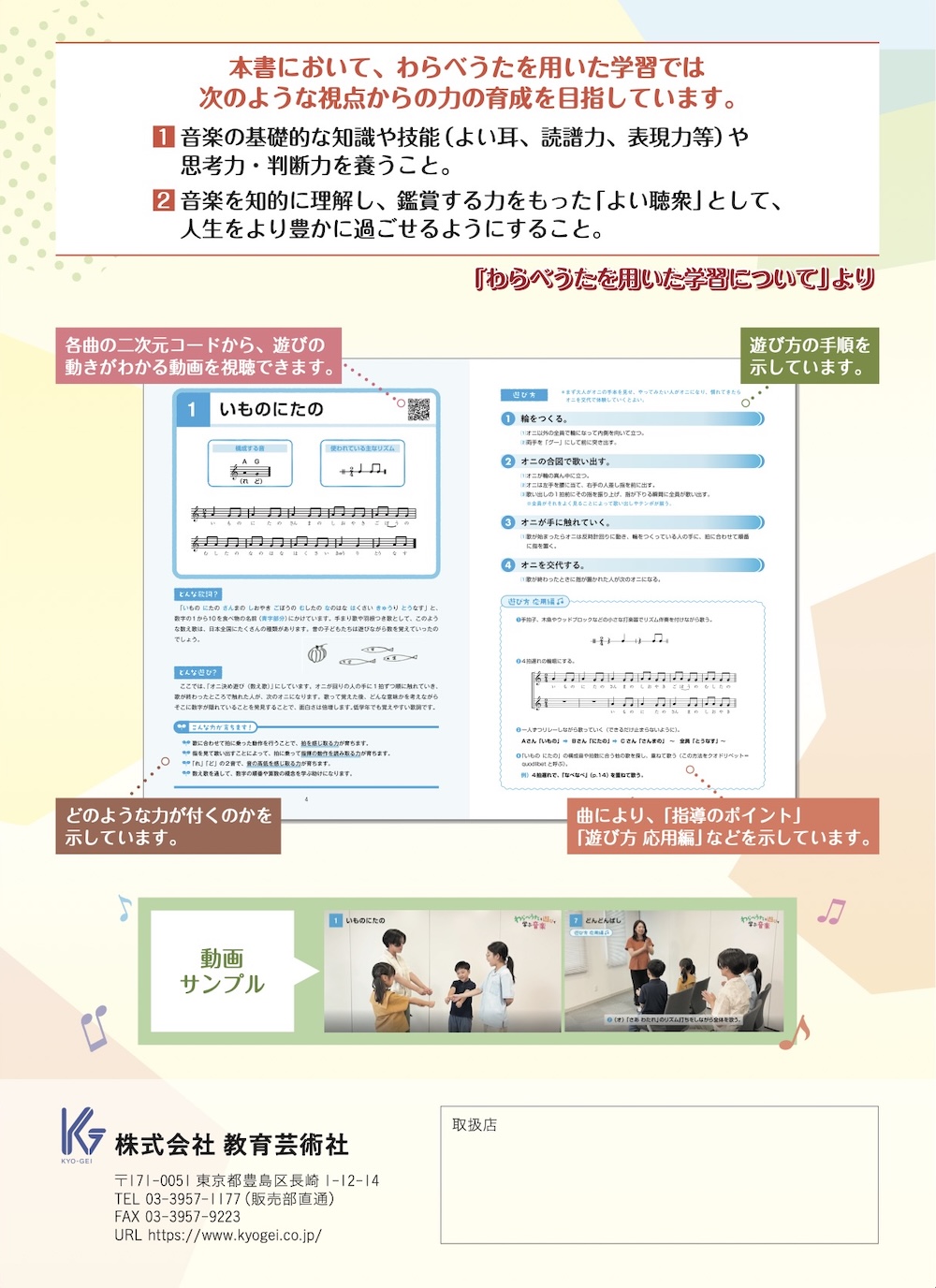 わらべうたを歌い、遊ぶことによって、どのような音楽の基礎的な力を付けることができるのか、どのように遊ぶのかをわかりやすく示しています。