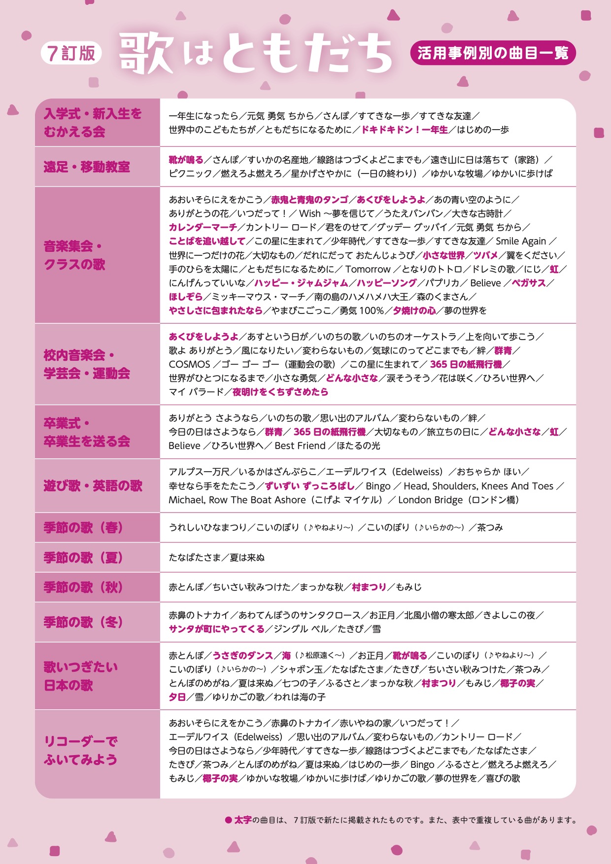 授業や行事など,ねらいや場面に合った曲を探しやすいように,〈入学式〉や〈卒業式〉,〈音楽集会〉や〈校内音楽会〉,〈季節の歌〉や〈歌いつぎたい日本の歌〉といった歌の手引きが充実。